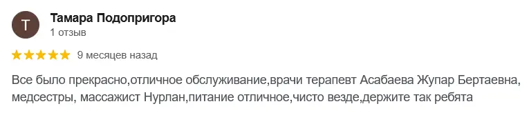 Бәрі тамаша болды, қызмет көрсетуі тамаша, дәрігер - терапевт Асабаева Жұпар Бертаевна, медбикелер, массажист Нұрлан. Тамағы тамаша, барлық жерде тазалық бар. Осы беттен айнымаңдар!