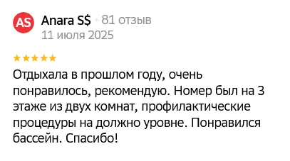 Өткен жылы демалдым. Өте ұнады, ұсынамын. Номеріміз 3 қабатта, екі бөлмеден тұрды. Профилактикалық процедуралары тиісті деңгейде. Бассейні ұнады. Рақмет!