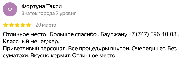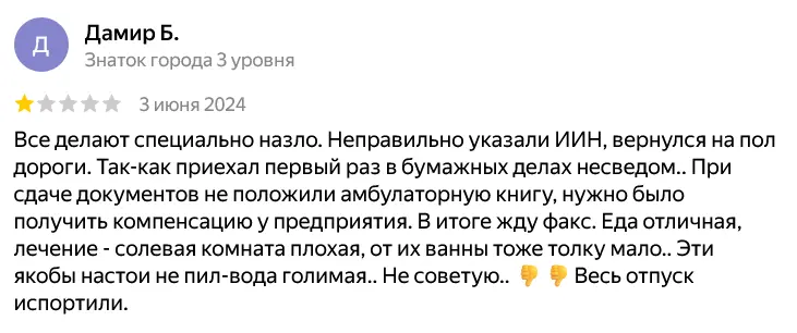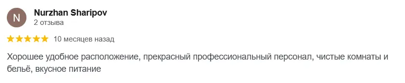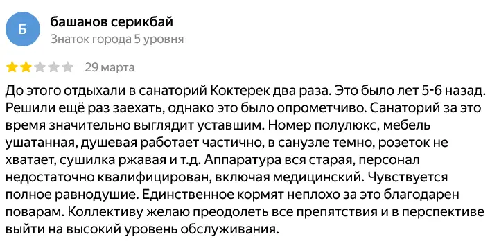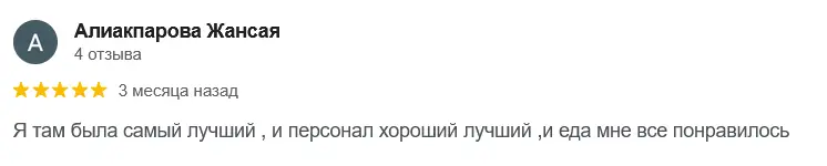 Құрал-жабдықтардың бәрі ескі, қызметкерлер, оның ішінде медициналық қызметкерлер де, біліктілігі жеткіліксіз. Толықтай енжарлық сезіледі. Тек тамағы жақсы, бұл үшін аспаздарға алғысымды білдіремін. Ұжымға барлық кедергілерді еңсеріп, болашақта жоғары қызмет көрсету деңгейіне жетуді тілеймін.