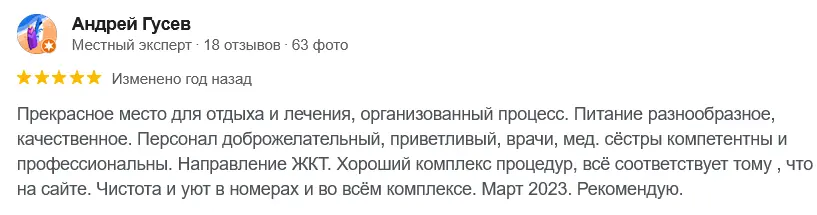 Демалыс пен емделу үшін тамаша орын, процесі жақсы ұйымдастырылған. Тамақтануы әртүрлі, сапалы. Персоналы ізгі ниетті, мейірімді, дәрігерлер мен медбикелер құзыретті және кәсіби мамандар. Бағыты асқазан-ішек жолдары (АІЖ). Процедуралар кешені жақсы, бәрі сайтта көрсетілгенге сәйкес келеді. Бөлмелерде және бүкіл кешенде тазалық пен жайлылық бар. Үш жыл қатарынан осы жерге келіп жүрміз.
