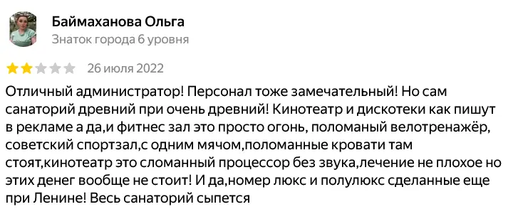 Ол жерде сынған велотренажер, бір добы бар кеңестік спорт залы, сынған төсектер тұр. Кинотеатр дегеніңіз – дыбыссыз, сынған проектор. Емделуі жаман емес, бірақ бұл ақшаға мүлдем тұрмайды! Иә, люкс және жартылай люкс бөлмелері Лениннің кезінде жасалған! Бүкіл санаторий тозығы жетіп тұр (немесе құлап тұр).