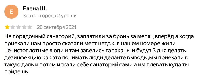 Әділетсіз (адал емес) санаторий. Біз бір ай бұрын бронь үшін ақша төлегенбіз, бірақ келгенде бізге жай ғана орын жоқ деп айтты. Себебі, біздің бөлмемізде таза емес адамдар тұрып, ол жерге тарақандар кіріп кеткен екен де, енді үш күндей дезинфекция жасайды дейді.